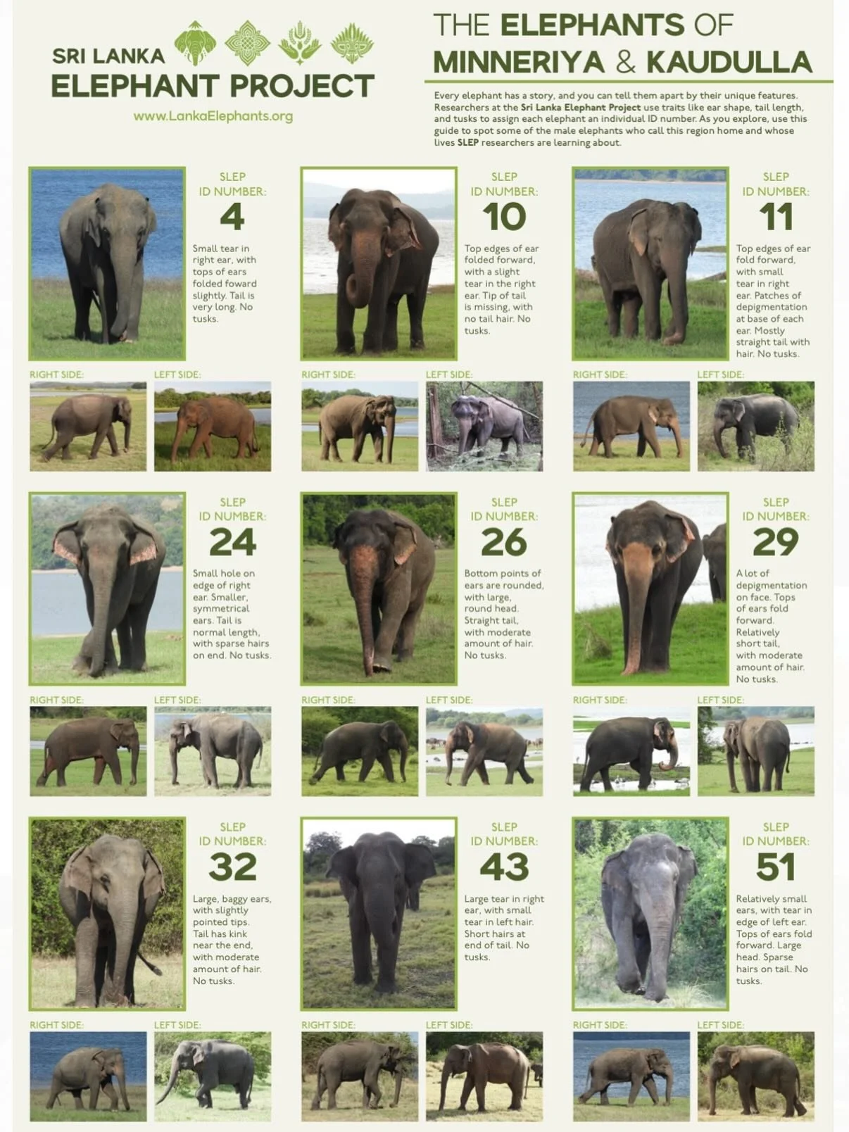 Want to test your elephant identification skills? Use this field guide to get to know some of the elephants that we study at SLEP. Each elephant has been assigned a unique three-digit identification number that acts like a name.